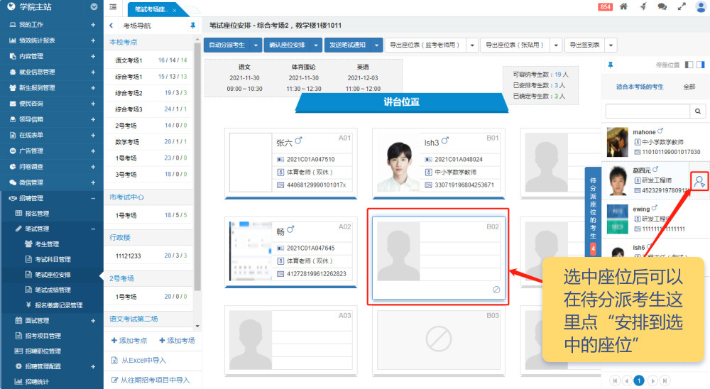 在后臺管理界面中,中欄顯示考點和考場導(dǎo)航信息。右側(cè)展示座位安排表,以所見即所得的方式顯示每個座位的考生信息。同時,右側(cè)還包含“待分派座位的考生”區(qū)域(僅在有待分派考生時顯示)。