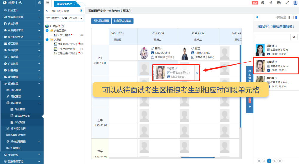 系統(tǒng)的中欄顯示本次招考項目的職位列表,每個職位名稱后標(biāo)注進(jìn)入面試流程的考生總數(shù)。若有“待安排面試時間”的考生,系統(tǒng)會以紅點提示。右側(cè)顯示待安排面試的考生列表,中間則為面試日程安排表。