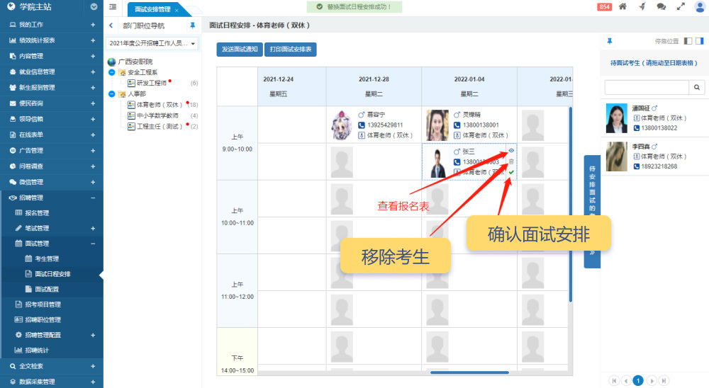 系統(tǒng)還支持確認(rèn)面試安排、發(fā)送面試通知、打印面試日程安排表等操作。
